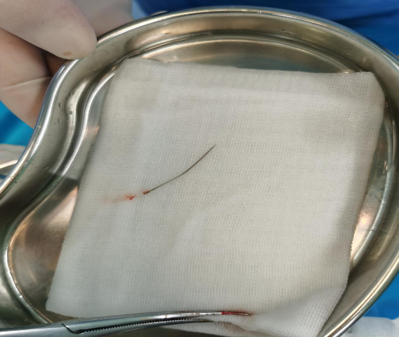 入院后完善各项检查、核酸检测、输液等对症处理。根据各项检查结果,科室组织讨论,田德福主任考虑钢针已刺入肝左叶,决定行腹腔镜下探查、腹腔异物取出术(备中转开腹)。当天下午15:00在麻醉科协助下行腹腔镜探查术,腹腔未探查到异物,见肝脏左叶膈面偏内侧有明显破损,结合术前腹部X线片及CT检查,基本确定钢针刺入肝脏左叶。再次详细探查腹腔未及异常,术中决定中转开腹探查。开腹探查确定肝脏膈面有损伤,其他部位未及异常。经过仔细探查确定钢针滞留在肝左叶内,最终历时约2个小时将肝左叶内的钢针顺利取出,手术术中未发生大出血及胆漏,术中患者生命体征平稳。目前正在康复治疗中。