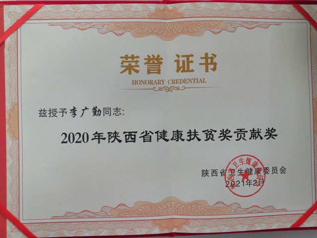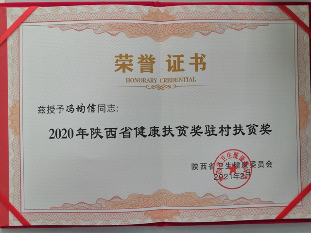 日前,陕西省卫生健康委对2020年全省健康扶贫工作进行了表彰。省第四人民医院荣获2020年健康扶贫奖、驻村扶贫奖,院党委书记李广勤荣获2020年陕西省健康扶贫贡献奖,医院驻村第一书记冯均信荣获驻村扶贫奖荣誉称号。