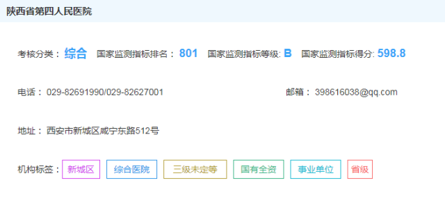 3月30日,国家卫生健康委公布2019年度三级公立医院绩效考核国家监测指标考核结果,陕西省第四人民医院在全国综合类医院排名中以598.8分的成绩跻身全国第801位,国家监测指标等级为B级。