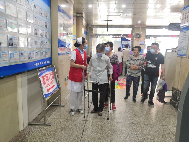 绿色通道体系从老年人进入医院疫情防控安检通道就开始发挥作用,工作人员会主动帮助老年人查看核酸报告,没有智能手机的老年人只需提供身份证等有效证件,即可在核酸报告查询机上一键查询检查结果。进入医院,在门诊大厅、导医台和挂号、收费窗口等处均设有“老年人优先、就医绿色通道”等引导标识;完善了电话、医院公众号、现场等多种预约挂号方式,医院还提供一定比例的现场号源,保留挂号、缴费、打印检验检查报告等人工服务窗口,缓解了老年人拨打电话、网络挂号中出现的各类不便;安排专职导诊人员协助老年人完成自助缴费、查单,亲友还可绑定家中老人信息,代老年人预约挂号、查询检查结果,设立老年人专用停车位等方便老年人就诊务实举措。