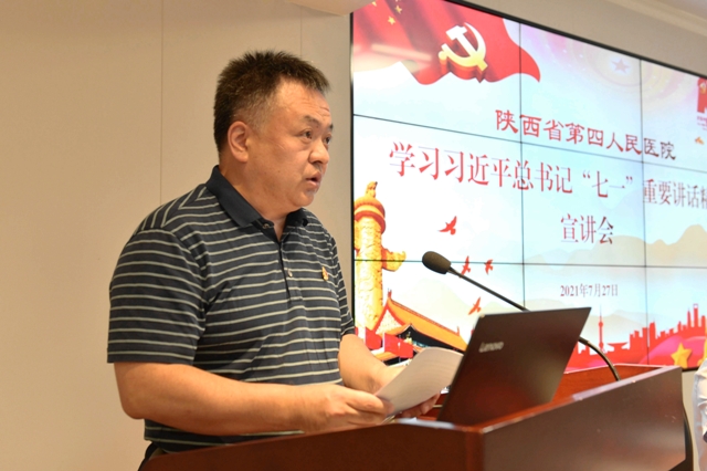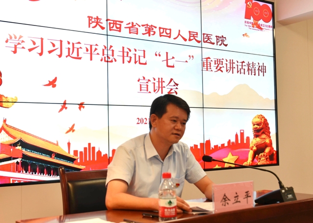 同志们,让我们更加紧密地团结在以习近平同志为核心的党中央周围,坚持习近平新时代中国特色社会主义思想为指导,认真学习贯彻习近平总书记“七一”重要讲话精神和来陕两次考察的重要讲话精神,奋力谱写陕西新时代追赶超越新篇章,奋力开展省四院新局面。通过共同学习,达成共识,积极响应“请党放心,强国有我”,对全体党员干部职工提出自觉践行初心使命,做到强院有我,为医院高质量发展贡献一份力量,方向决定道路,找准正确道路,四院将会有更加灿烂的明天。