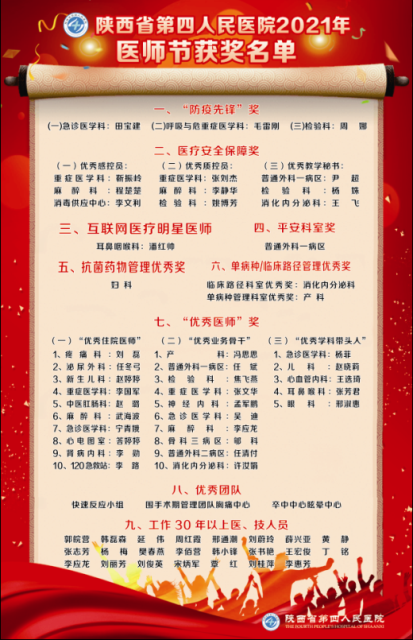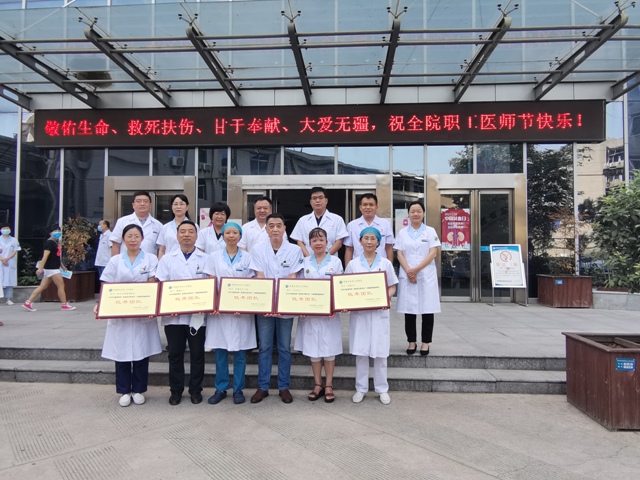 为表彰先进,树立典型,增强医师职业荣誉感,院领导班子向获奖的优秀医师、优秀团队、工作 30 年以上医、技人员进行了颁奖。在慰问与表彰活动中,贾延院长勉励广大医师和医务人员不忘初心,牢记救死扶伤的使命,继续弘扬敬佑生命,救死扶伤,甘于奉献,大爱无疆的崇高精神,当好人民健康的忠诚卫士,为群众提供高质量的医疗卫生服务。
