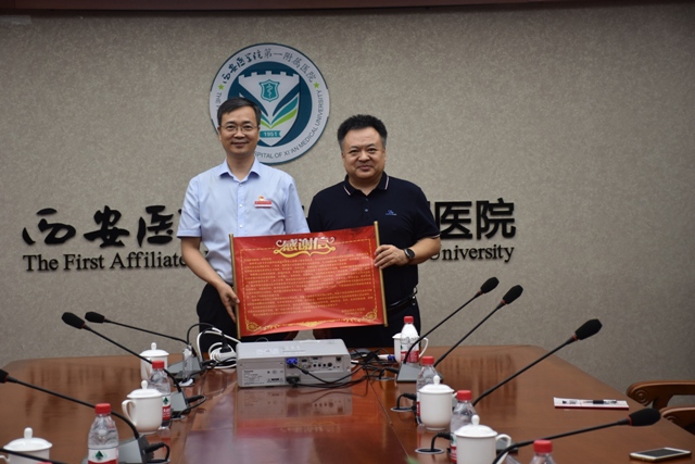座谈会上,省四院向西安医学院第一附属医院赠送了感谢信并将一面绣有“派医学精英传技术,遣杏林使者铸友谊”锦旗赠送给闫红林院长,表示对西安医学院第一附属医院的衷心感谢。