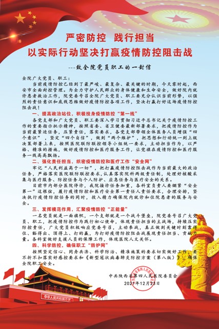 坚持同舟共济,共克时艰,以饱满热情投入疫情防控。一场突如其来的疫情,让古城西安人民猝不及防,医院全体职工与全省人民一道风雨同舟、众志成城,构筑起疫情防控的坚固防线。省市联防联控指挥部、卫生健康委的领导多次来医院检查指导鼓劲打气,为了保障基本医疗和日常工作不受影响,医院行政职能部门有医学背景的职工也参加到了疫情防控队伍中,她们用最炽热的情怀,与古城人民一起守护家乡,保卫西安。