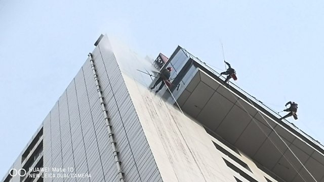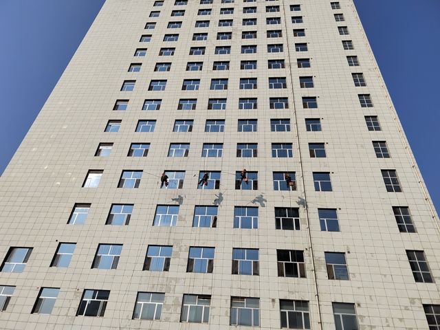 清洗工作于2月22日开始,持续到28日结束。清洁人员身系安全带,用刮刀和水管从上到下仔细清洗大楼外墙、玻璃以及外窗。一周以来,专业人员通过“洗脸、祛斑、美颜”操作,对新住院大楼外墙和玻璃进行了全面清洗。经过清理,新住院大楼外围环境焕然一新,院容院貌明显提升。