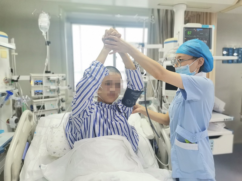 在ICU的日子里,医护团队反复讨论治疗方案,不断调整,亚低温治疗、机械通气、抗感染、抗炎、补液、营养神经、促醒、镇痛镇静等治疗,每一个医嘱都慎之又慎,翻身、扣背、吸痰、皮肤管理、管路维护每一次操作都小心翼翼,我们知道监护室外孩子家人的期盼,更重要的是知道生命的鲜美和我们的责任。寸步不离的守护与呼唤终于换来了孩子第一次睁眼,我们流泪了---是欣喜的泪水、是激动的泪水,我们为孩子感动,为生命感动!第7天,顺利脱机,完全清醒,爸爸、妈妈、妹妹的名字能够清晰记得。为了患儿更优质的回归家庭、回归学校、回归社会,医护团队经过全面评估后,给予患儿个性化治疗的方案,进行精准治疗,开展一系列康复锻炼——被动活动、主动活动、上下肢锻炼、吞咽功能康复、呼吸功能训练、语言功能锻炼、行走训练……各项丧失的功能,被一项一项找回来了。护士长带领责任护士每天和患儿交流、心理护理、定时播放他喜欢的音乐、讲故事等减缓焦虑情绪。医护的日夜守护,第18天,患者终于可以下床了!