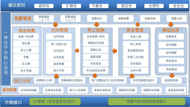 项目建设以预算管理为主线,整合经济运行活动中的重点环节:预算管理、合同管理、网上报销、收费平台、奖酬发放,将精细化与内部控制理念有机融合,整合经济活动功能与信息共享,将业务流程与风险管控关联,实现经济活动的全生命周期闭环管理,优化资源配置,实现财务服务功能与价值体现,为医院高质量发展提供新效能。