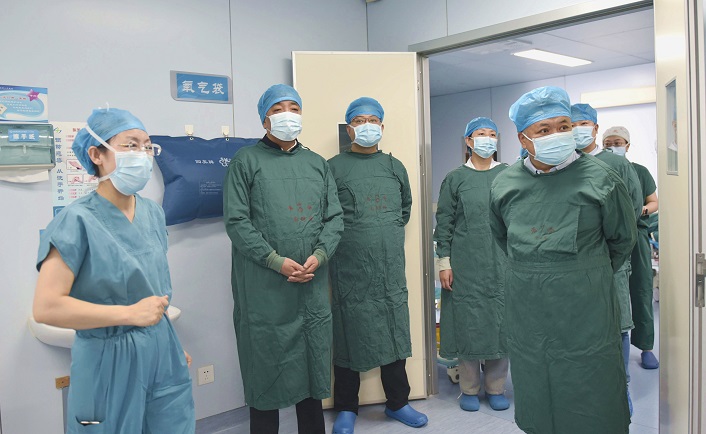 在住院部19楼,与会同志走进麻醉手术部更衣间在工作人员的指导下大家严格按照要求穿手术隔离衣、戴一次性口罩帽子,有序步入宽敞明亮的手术室,仔细询问手术室运转、新高精端医疗设备使用等情况,对开台时间、三方核查签字、外科病例术前检查及签字的完整性等进行检查询问,并观摩了亚色视频 首台高精端医疗设备神经外科手术导航系统。