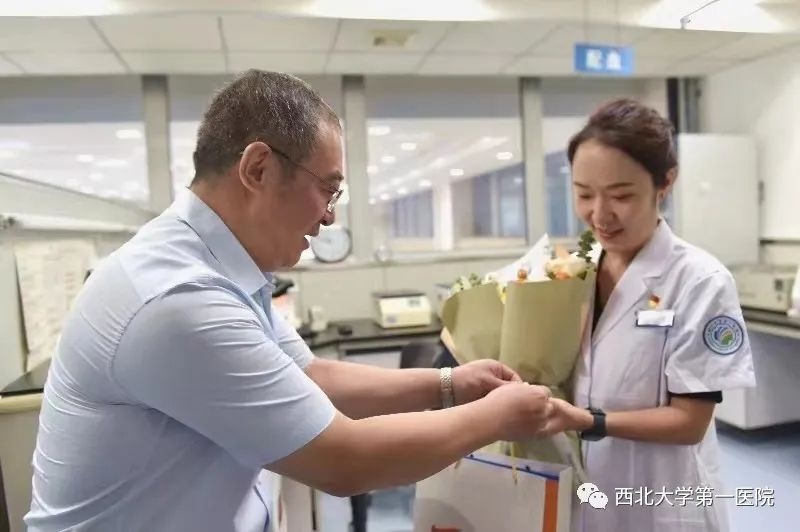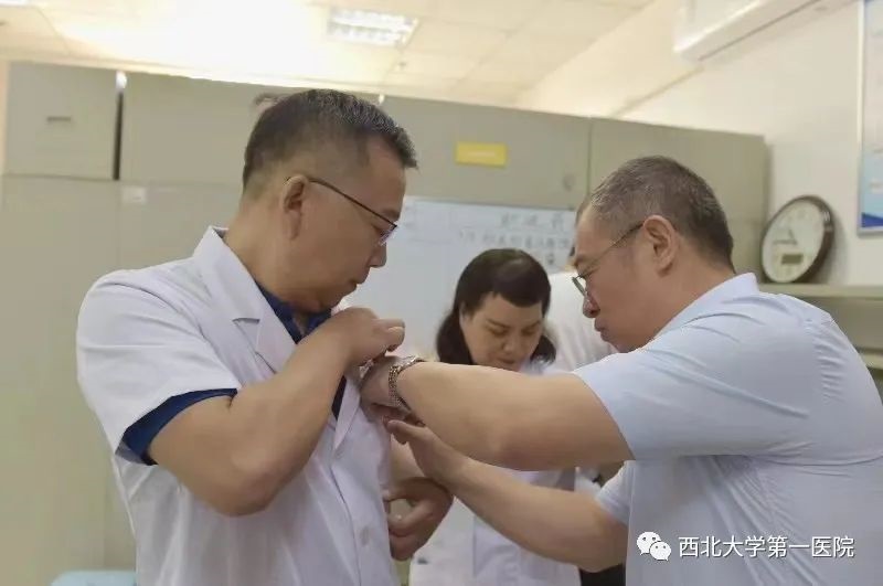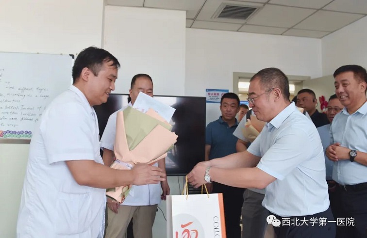 在普通外科、医学检验科、药学部以及第三门诊部,常江一行在院领导和相关科室负责人的陪同下为教师代表送上鲜花并亲手为他们佩戴象征西大教职工身份证明的西北大学校徽,嘱咐全体教师和医务工作者践行“公诚勤朴”校训,做合格的“西大”人,为医学教育事业培养更多的优秀人才。