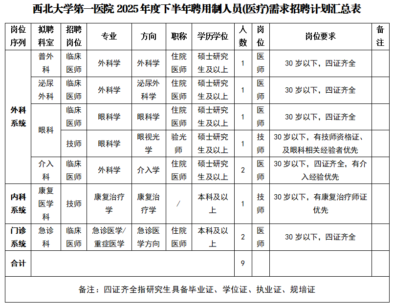 (四)学历要求:住院医师学历为硕士及以上(除急诊科、康复医学科);