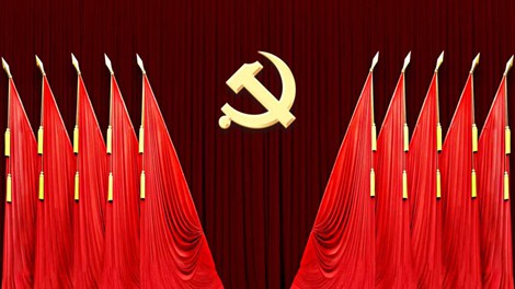 大会会场氛围庄重热烈。主席台上金色的党徽与十面鲜艳的红旗相映生辉,璀璨穹顶绽放夺目光彩。正前方电子屏上播放着“中国共产党亚色视频 第一次党员代表大会”的会标。